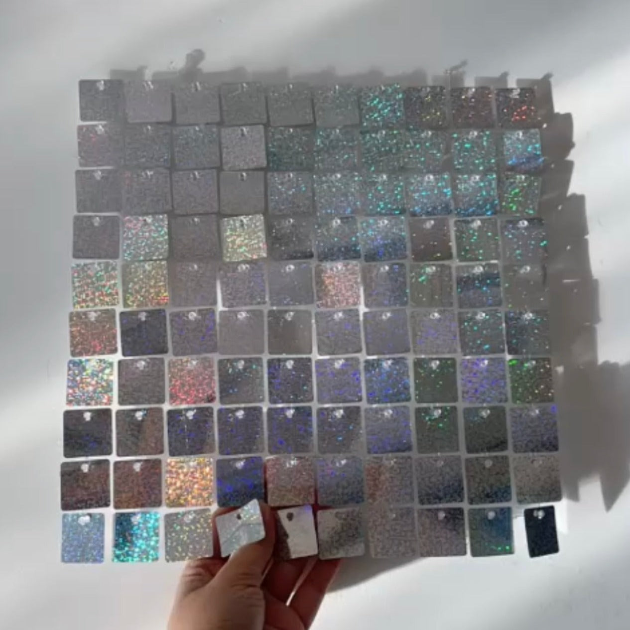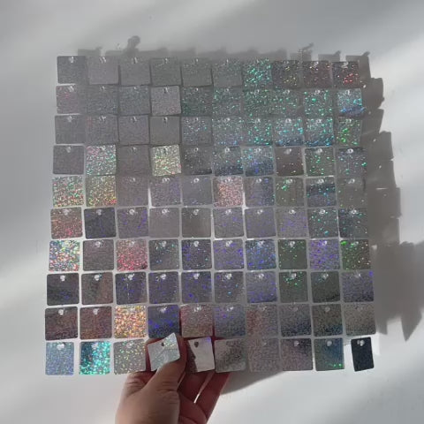 Our sequin walls are built on new style clear grid backing 30cm x 30cm panels. New model clip technology is much more flexible and easier to connect than models available from other suppliers